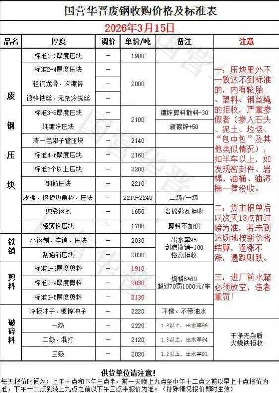 瑞賽格通知 各供應(yīng)商: 我公司于****年*月**日上午*時(shí),鋼筋切粒一級、二級,優(yōu)質(zhì)重廢、重一、重二、重三,重四,厚剪料、厚剪毛料、剪切毛料統(tǒng)一上調(diào)**元。 大量采購毛料(加工費(fèi)剪切類**元起,燒割剪切混合**元起,燒割類***元起)量大可議。 執(zhí)行最新價(jià)格。